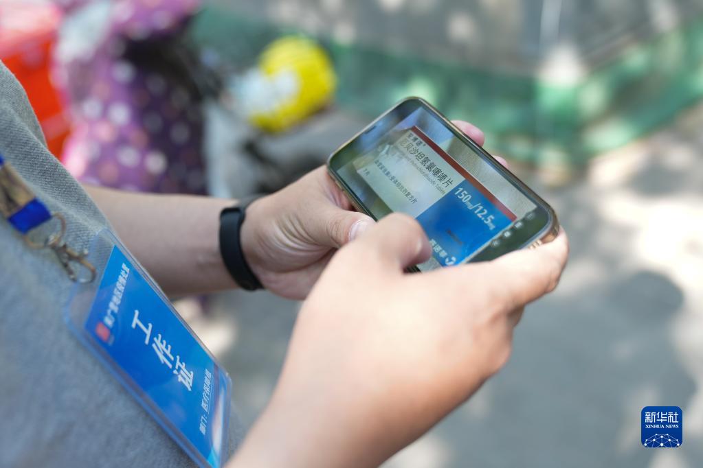 梅晓东在出发购药前查看手机微信群内居民发来的需求药物照片(5月21日摄)。