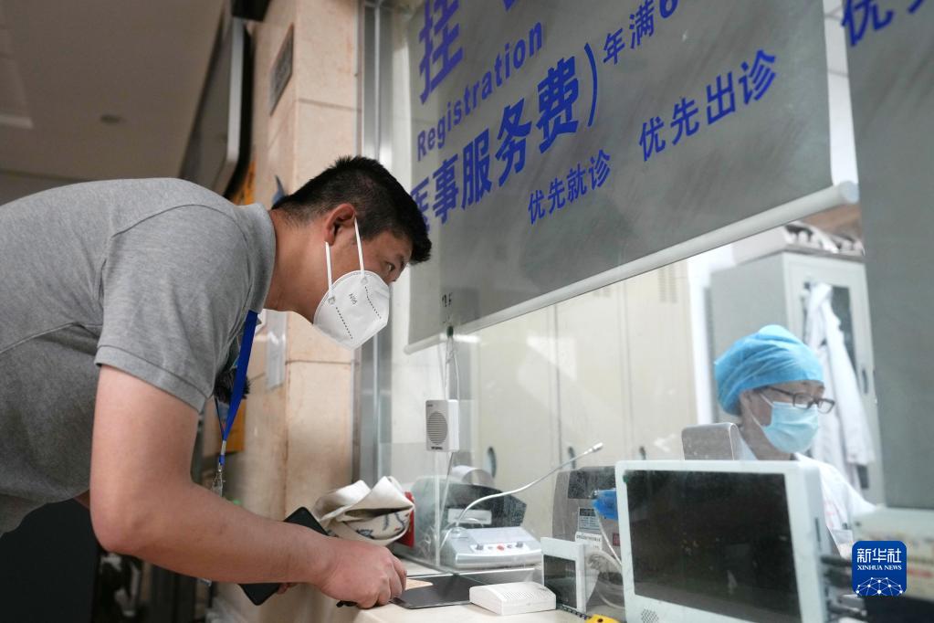 在北京市朝阳区来广营社区卫生服务中心,梅晓东(左)为封管控区域居民挂号开药(5月21日摄)。新华社记者 鞠焕宗 摄