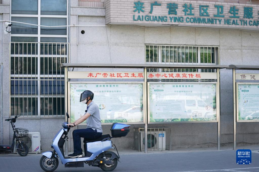 购药结束后,梅晓东离开来广营社区卫生服务中心,前往被封管控的小区(5月21日摄)。新华社记者 鞠焕宗 摄