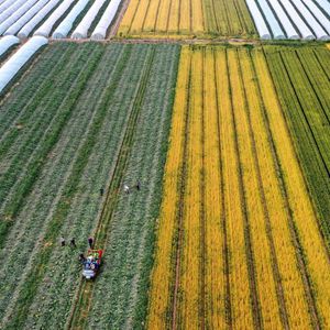 5月22日,蒲城县龙池镇重泉村的村民在收获西甜瓜(无人机照片)。