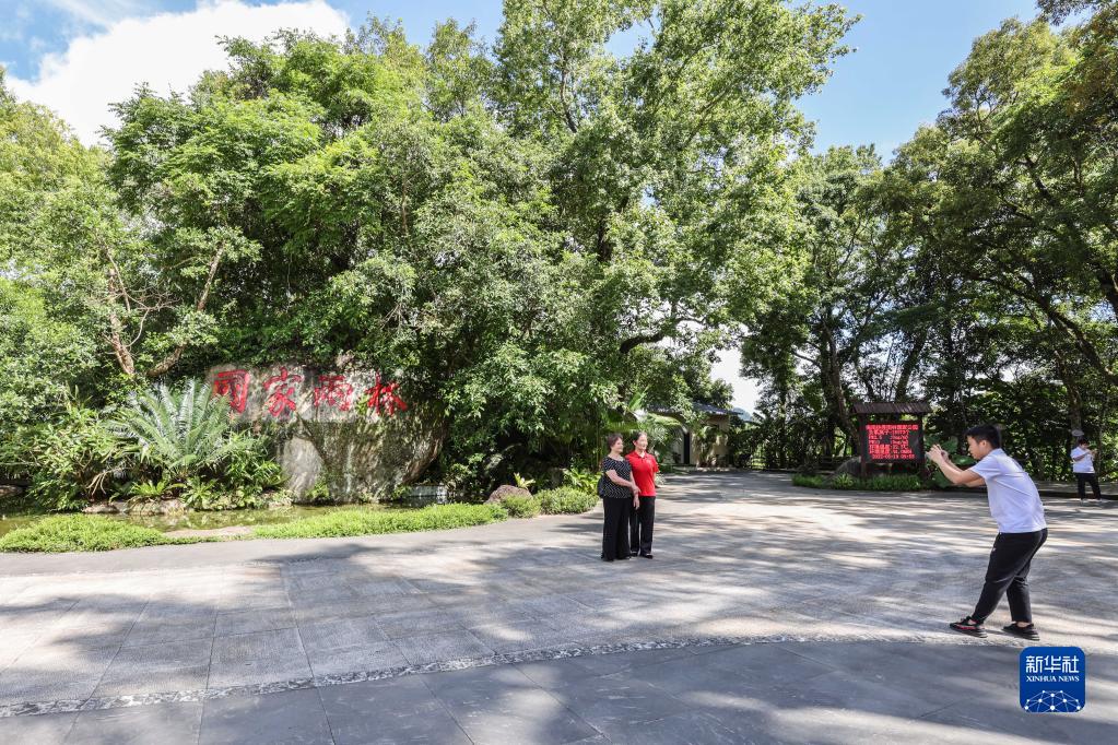 游客在海南热带雨林国家公园五指山片区的雨林广场合影留念(5月19日摄)。