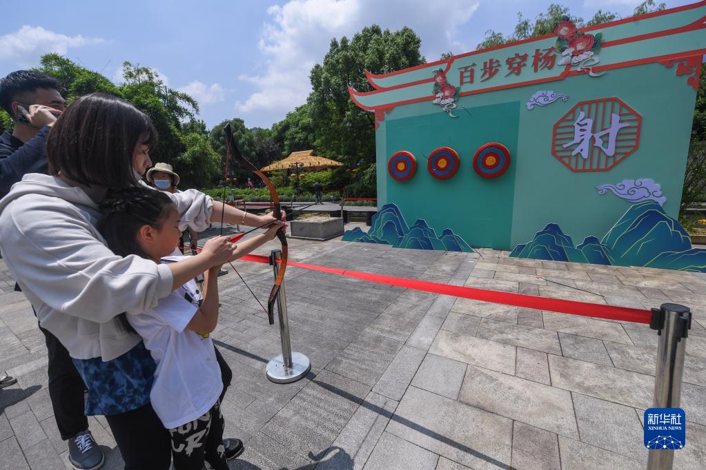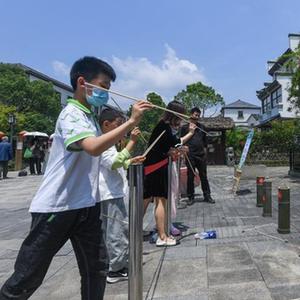 5月22日,游客在径山镇的陆羽文化街区体验传统游戏。