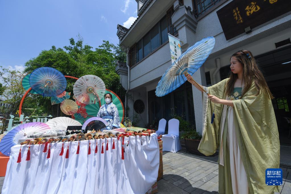 5月22日,游客在径山镇的陆羽文化街区选购纸伞。