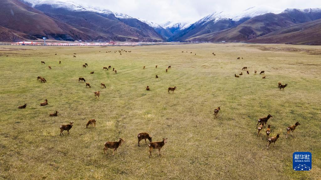 这是5月21日在类乌齐马鹿国家级自然保护区拍摄的马鹿(无人机照片)。