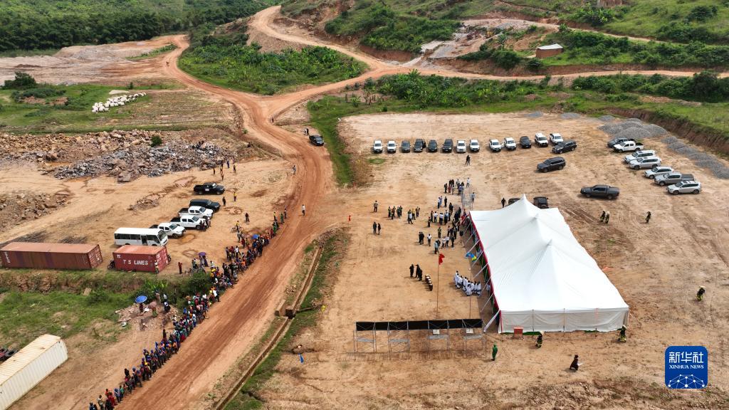 这是5月21日在卢旺达北方省加肯凯市拍摄的中企承建卢旺达那巴龙格河二号水电站项目开工仪式现场(无人机拍摄)。