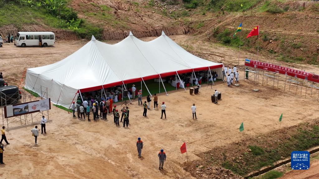这是5月21日在卢旺达北方省加肯凯市拍摄的中企承建卢旺达那巴龙格河二号水电站项目开工仪式现场(无人机拍摄)。