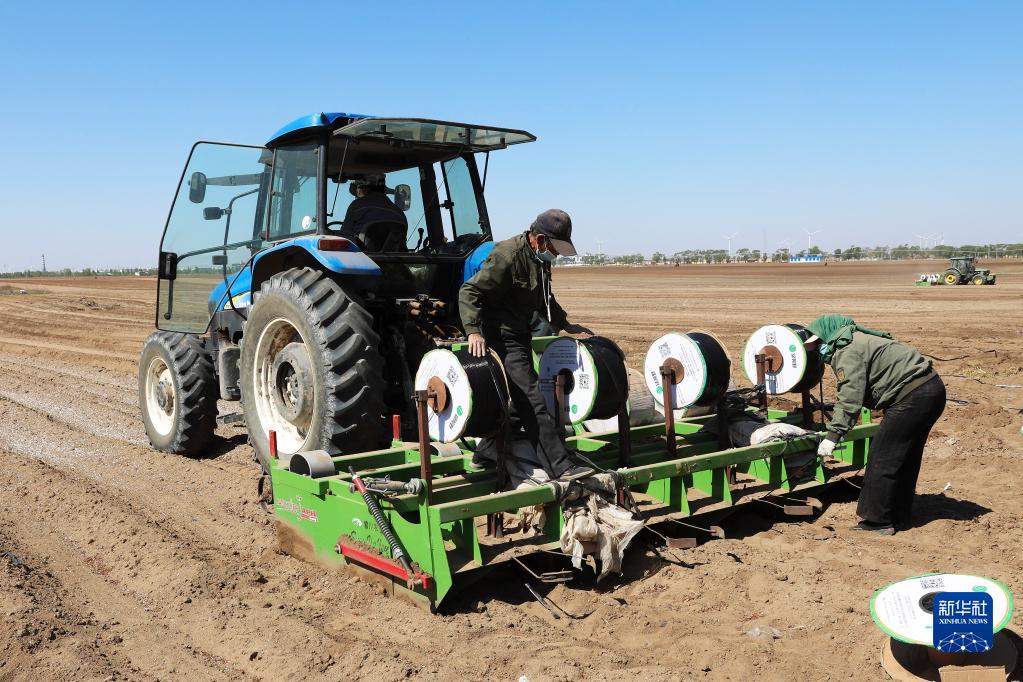 5月22日,农民操作机械设备在张家口市察北管理区马铃薯种植基地铺设滴灌带。