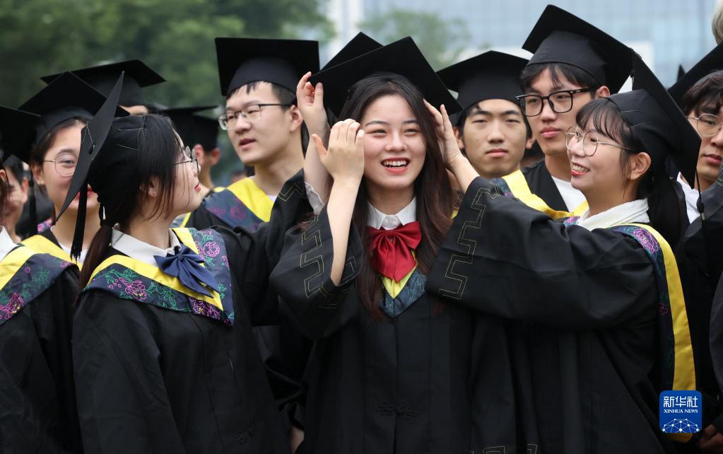 5月23日,浙江工业大学莫干山校区应届毕业生在拍摄毕业照前相互整理着装。