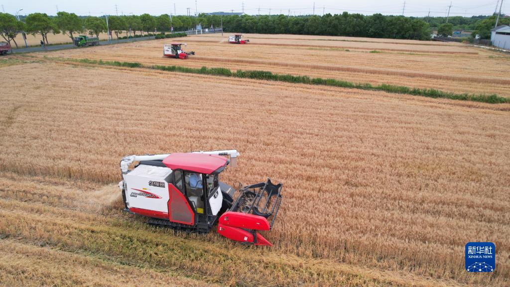 5月23日,在江苏省太仓市璜泾镇雅鹿村,农民驾驶收割机抢收小麦(无人机照片)。