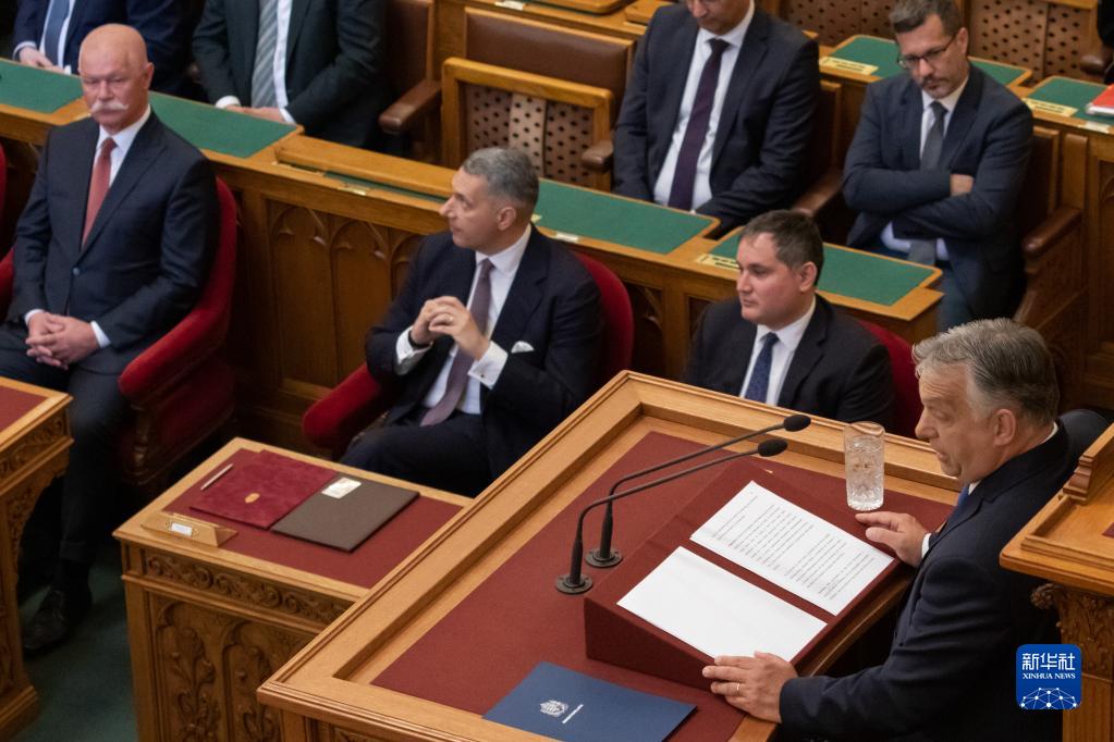 5月24日,在匈牙利布达佩斯国会大厦,匈牙利总理欧尔班(右一)在新一届政府宣誓就职前发表讲话。