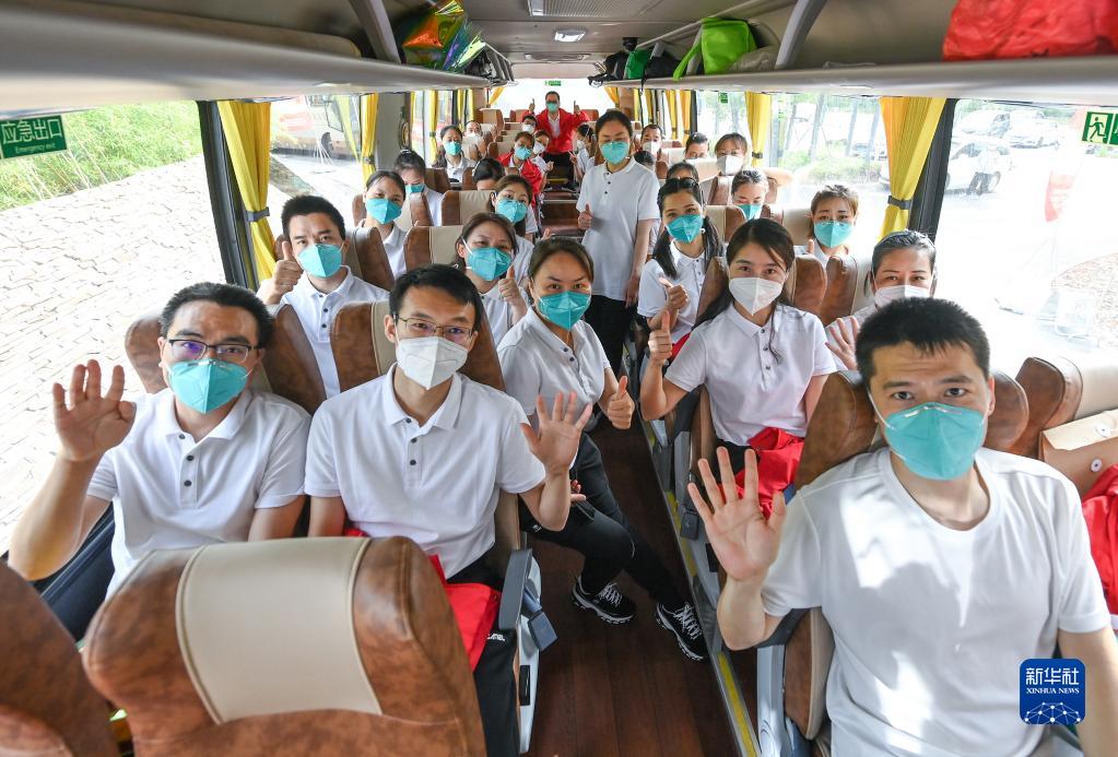 5月25日,即将撤离的医疗队员们在大巴车上挥手道别。