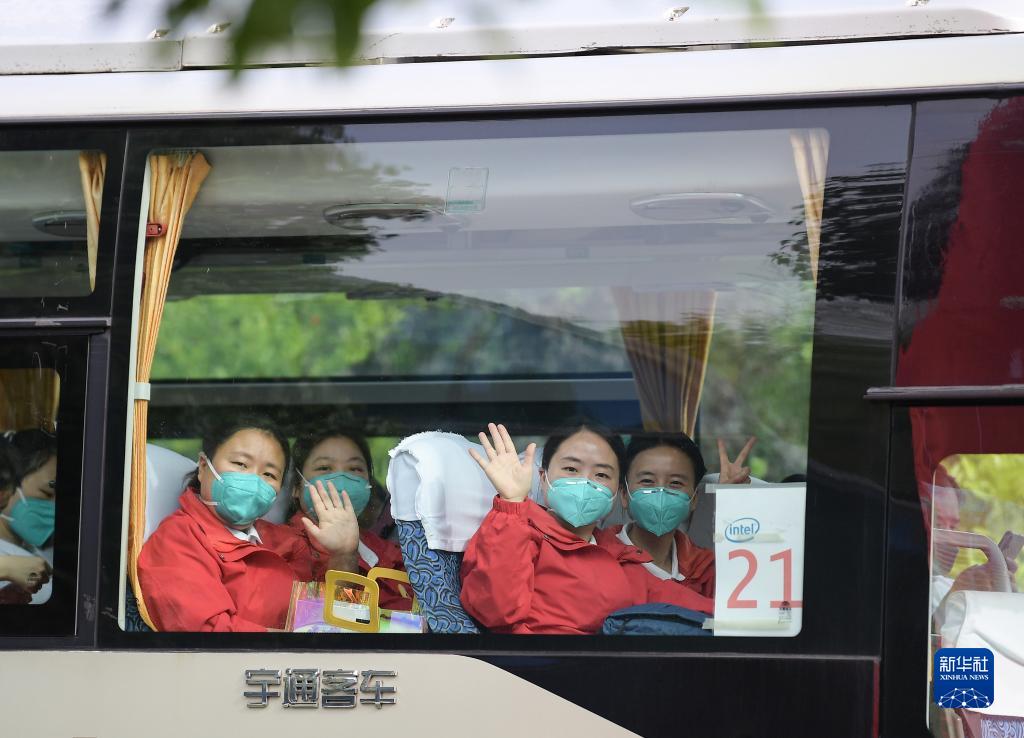 5月25日,即将撤离的医疗队员们在大巴车上挥手道别。