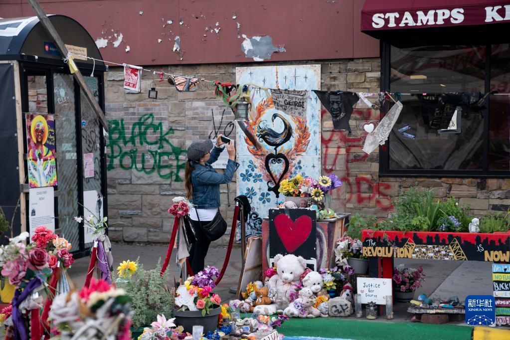 5月22日,在美国明尼苏达州明尼阿波利斯市,一名女子在弗洛伊德广场参观。