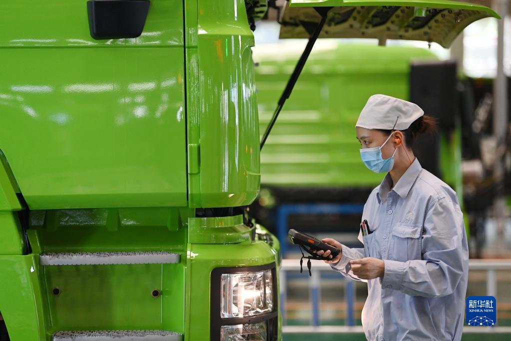 5月24日,工作人员在陕西汽车控股集团有限公司总装车间验收一辆装配完毕的陕汽重型卡车。