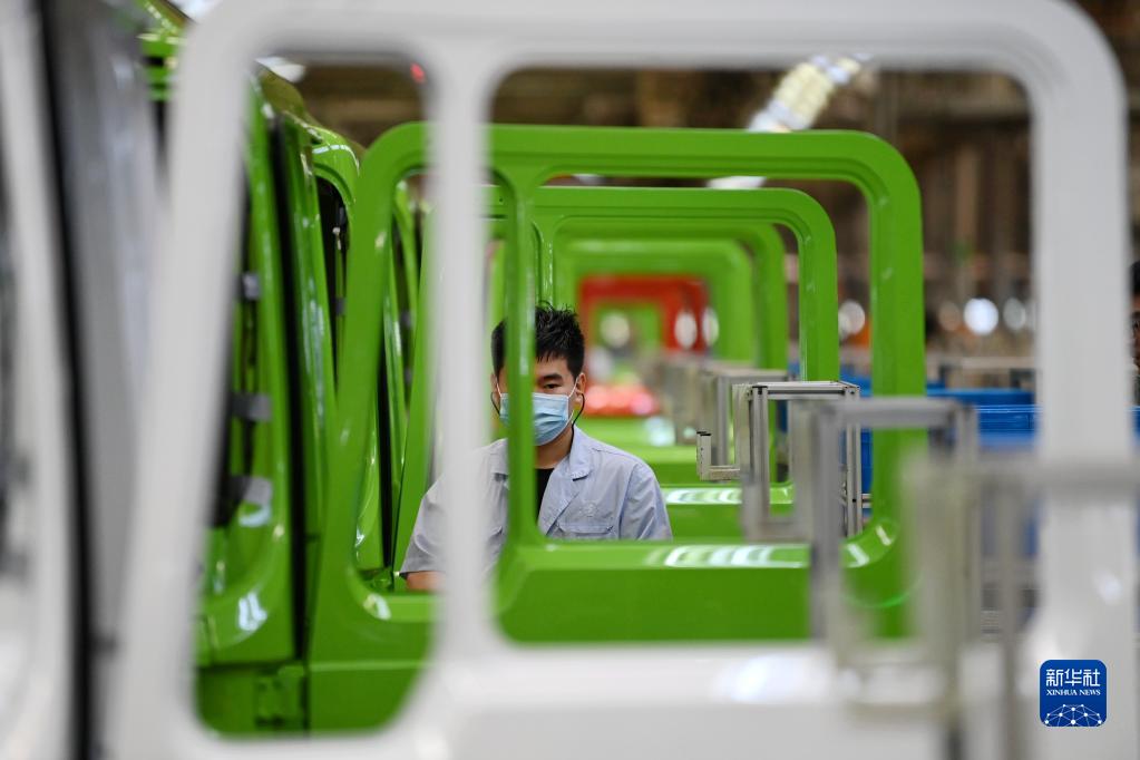 5月24日,工人在陕西汽车控股集团有限公司总装车间进行重型卡车装配。