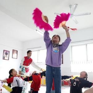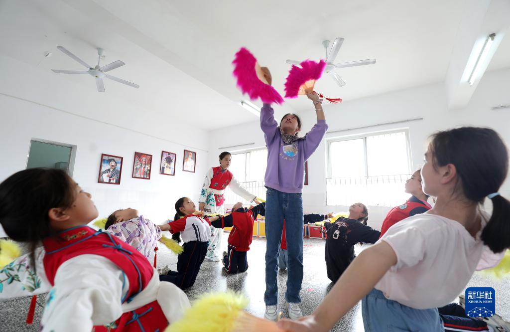 5月25日,在湖南省资兴市鲤鱼江完小,戏曲老师指导学生学习戏曲基本动作。