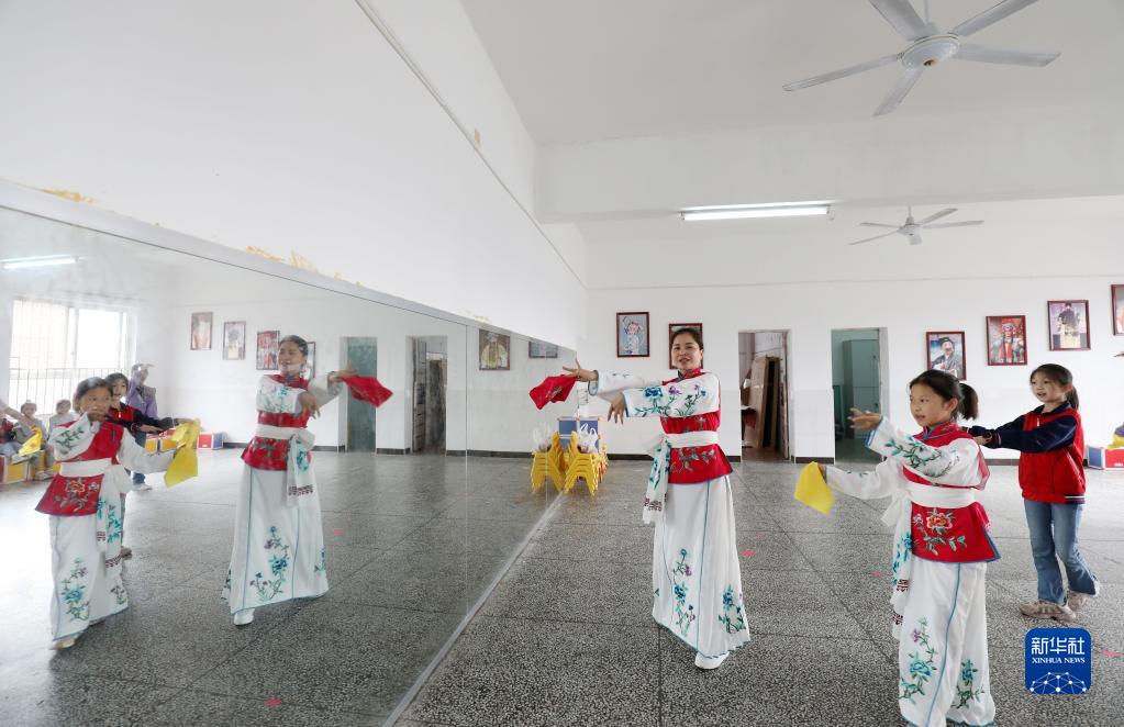 5月25日,在湖南省资兴市鲤鱼江完小,戏曲老师指导学生学习戏曲基本动作。