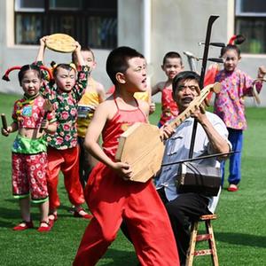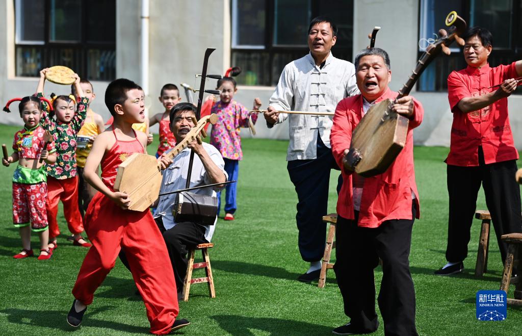 5月26日,黄河老腔艺术团的老艺人在幼儿园为孩子们传授老腔艺术技巧。