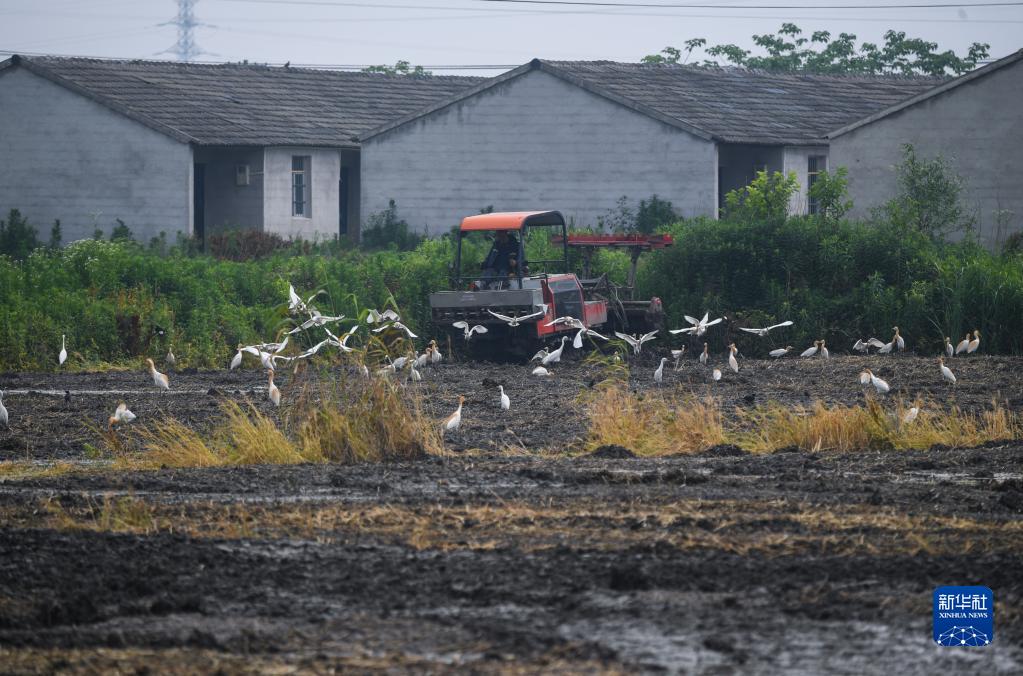 5月26日,农业社会化服务人员在东林镇保丰村操作农机耕田。