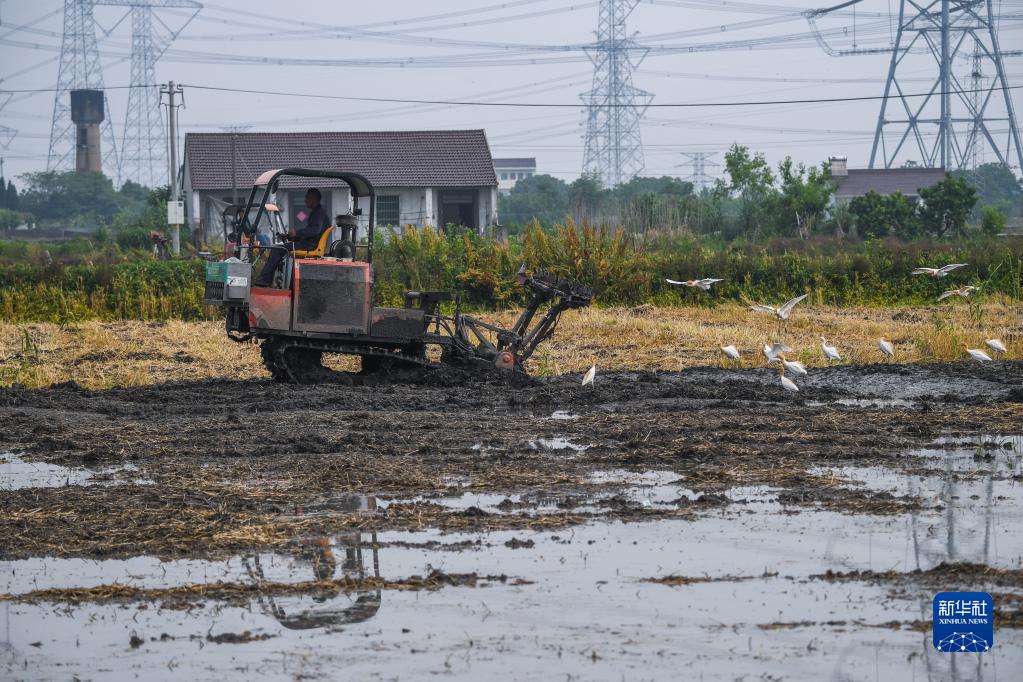 5月26日,农业社会化服务人员在东林镇保丰村操作农机耕田。