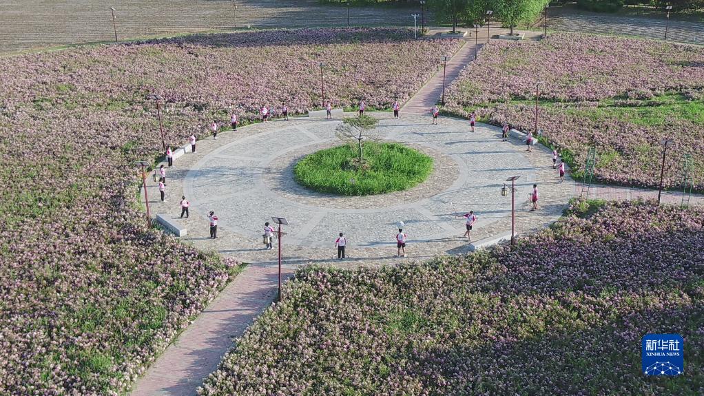 5月25日,吴桥县张硕杂技艺术中心学员在吴桥县运河公园练习杂技(无人机照片)。