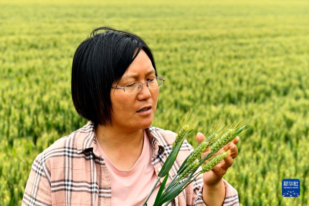 5月26日,在泰安市岱岳区马庄镇,种粮大户薛丽娜查看小麦灌浆情况。