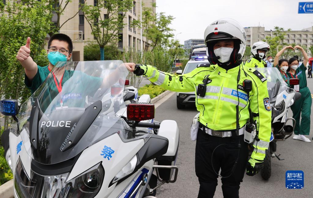5月26日,一名江苏省援沪医疗队方舱队队员(左)与骑警对拳合影。