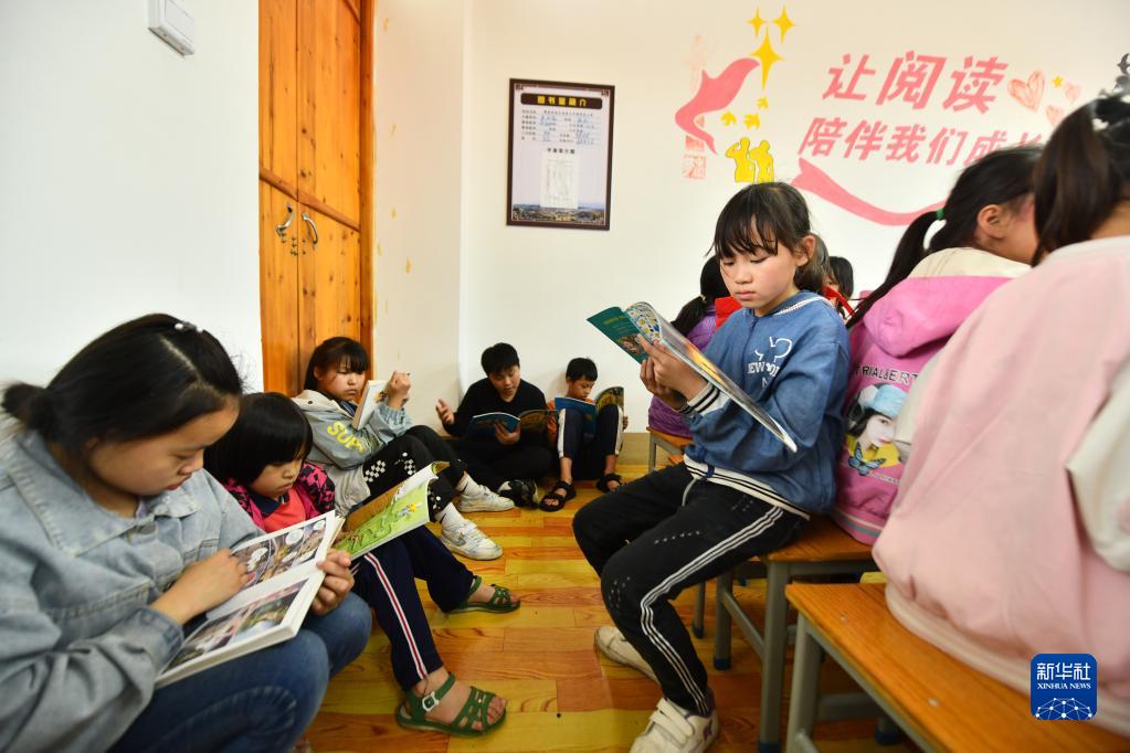 骨龙村小学学生在图书室阅读(5月25日摄)。