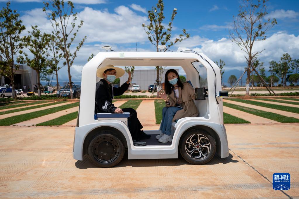 5月26日,在工业级5G创新应用(大理)研究院内,参观者在体验无人驾驶观光游览车。