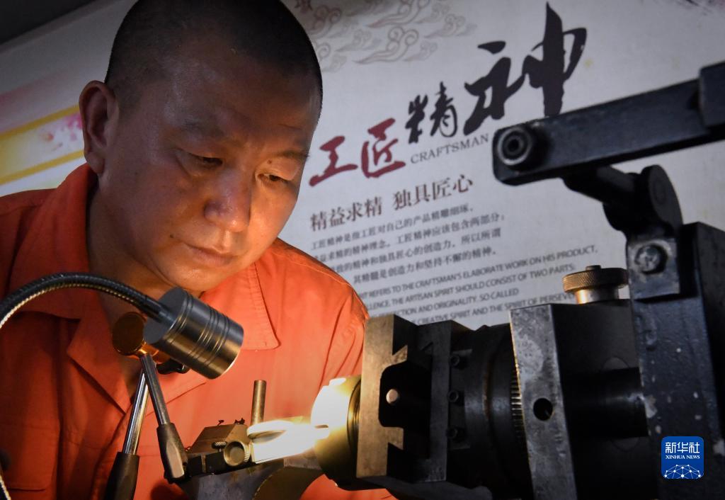一盏台灯,一台机器,一名匠人,在光影交错中雕刻着流逝的时光,表盘上的花纹折射出璀璨的光亮。1978年出生的程育财是为数不多掌握玑镂刻花工艺的工匠之一,目前在河南省新密市职教中心任教,2020年获得“河南省工艺美术大师”称号。