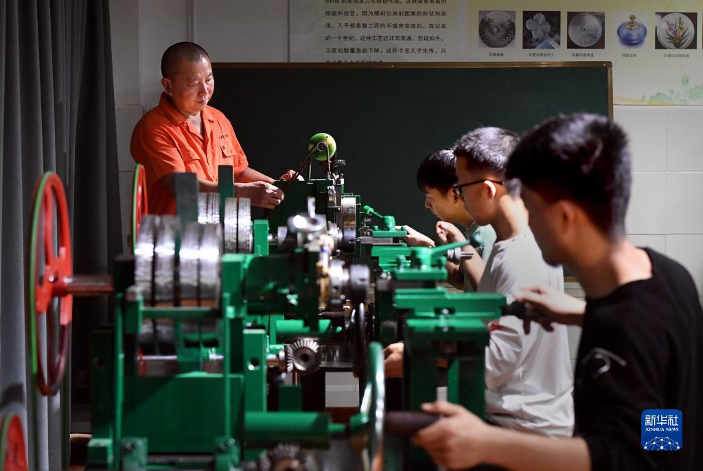 5月24日,程育财(左一)在工作室内指导徒弟们练习操作玑镂刻花机。