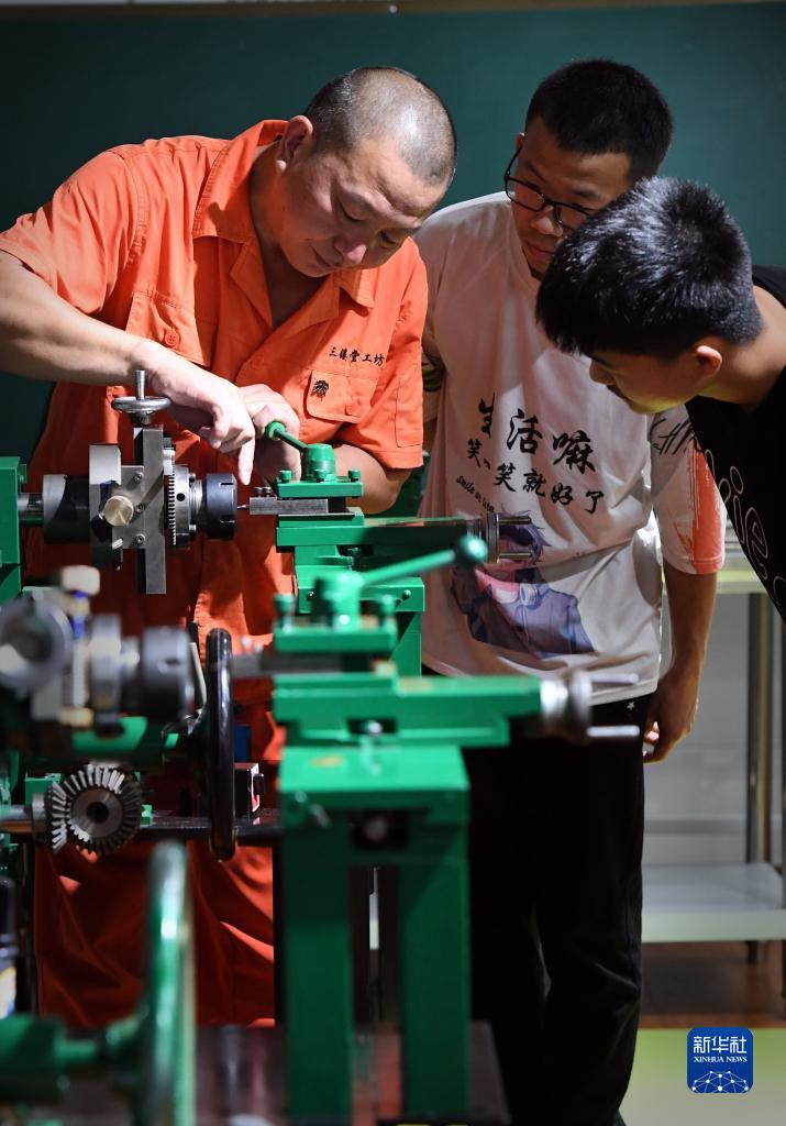 5月24日,程育财(左)在工作室内为徒弟讲解玑镂刻花机的操作规范。