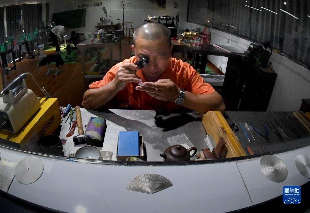 一盏台灯,一台机器,一名匠人,在光影交错中雕刻着流逝的时光,表盘上的花纹折射出璀璨的光亮。1978年出生的程育财是为数不多掌握玑镂刻花工艺的工匠之一,目前在河南省新密市职教中心任教,2020年获得“河南省工艺美术大师”称号。