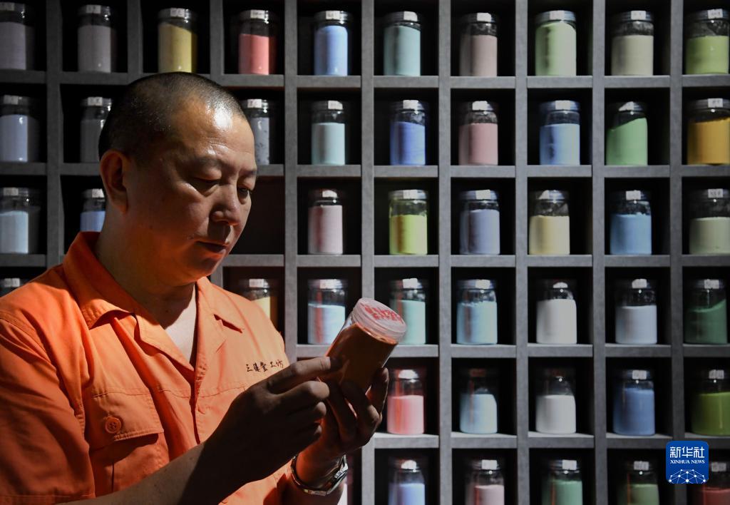 5月24日,程育财在工作室内挑选珐琅颜料。