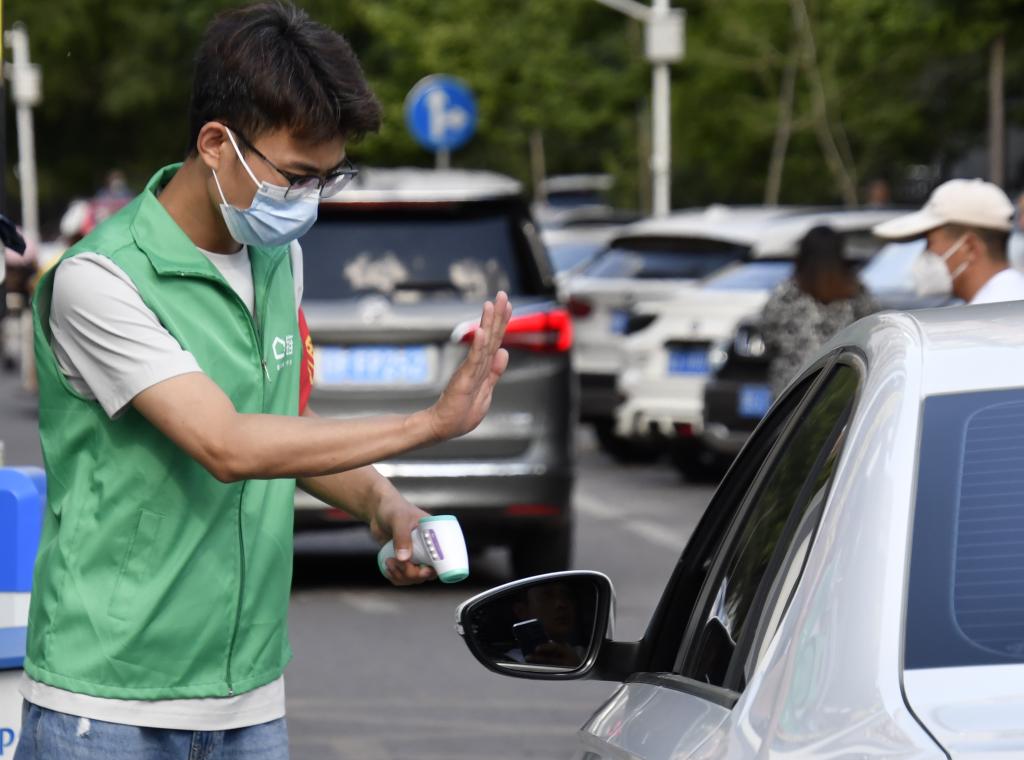 共青团员、青年志愿者姜宽在北京朝阳区八里庄街道十里堡社区的入口进行测温和健康码查验(5月26日摄)。