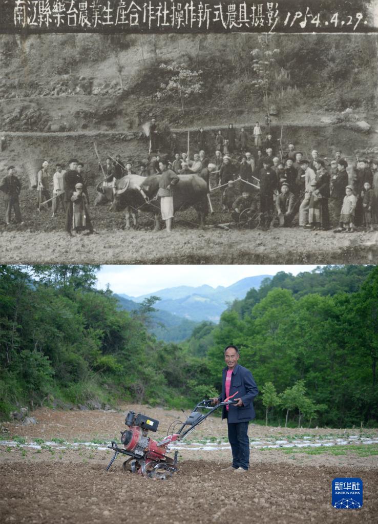 拼版照片:上图为1954年4月29日,巴中市南江县乐台村农业生产合作社社员在操作当时的新式农具(资料照片);下图为5月12日,巴中市通江县诺水河镇小骡马村村民李国芝在操作旋耕机(新华社记者 刘坤 摄)。