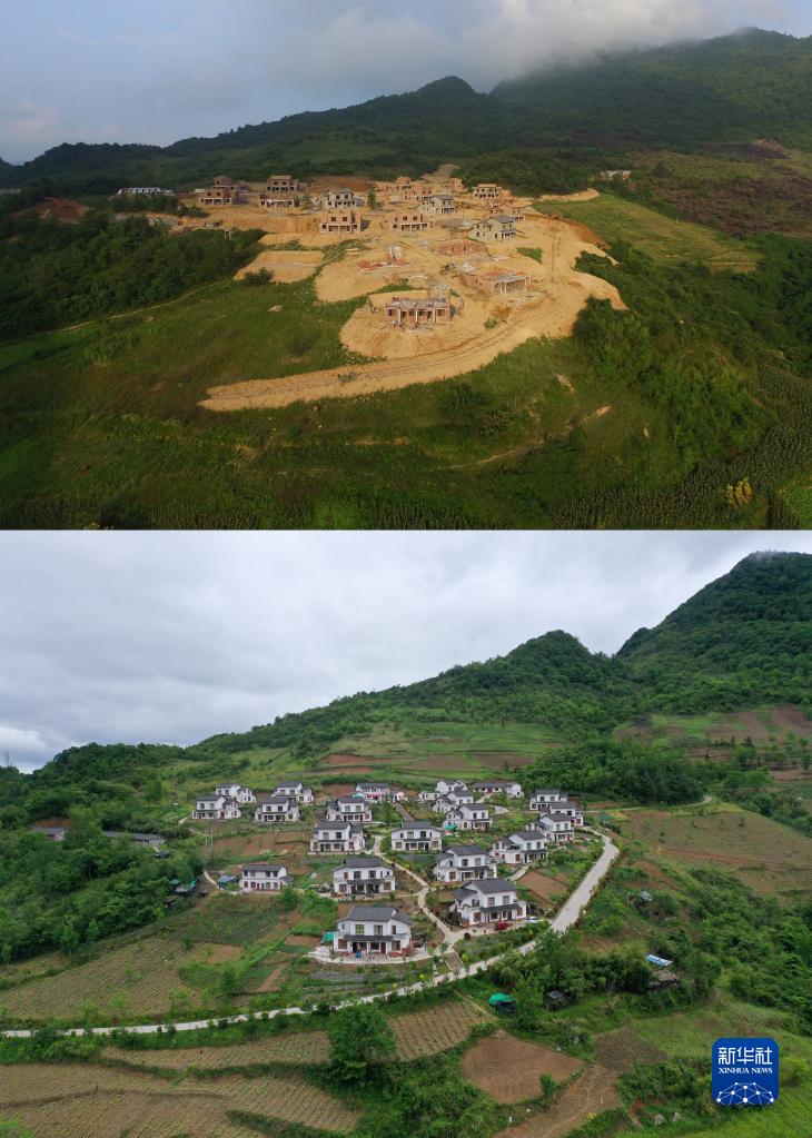 拼版照片:上图为2016年8月22日拍摄的修建中的巴中市通江县空山镇青龙村易地扶贫搬迁安置点(无人机照片);下图为5月13日拍摄的青龙村易地扶贫搬迁安置点,这里共安置易地搬迁群众78户329人(无人机照片)。空山镇是中国工农红军“空山战役”战斗的地方。