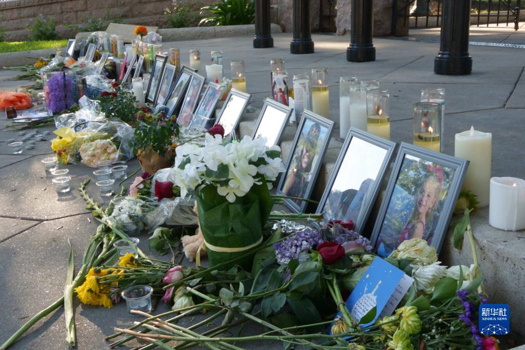 5月26日,在美国得克萨斯州首府奥斯汀,尤瓦尔迪校园枪击事件遇难者的照片以及鲜花蜡烛等物品被摆放在得州议会大厦前。