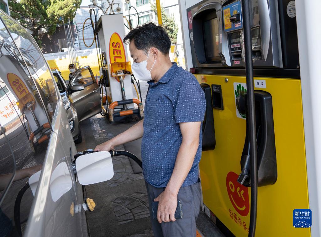 5月27日,市民在韩国首尔一家自助式加油站加油。