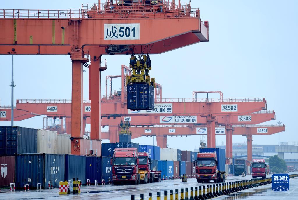 5月27日,在成都国际铁路港,工作人员为化肥班列装运集装箱。