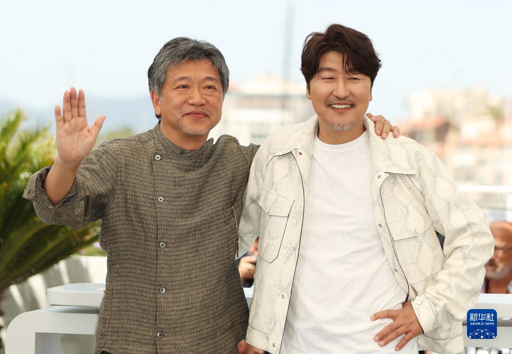 5月27日,在法国戛纳举行的第75届戛纳国际电影节上,日本导演是枝裕和(左)和韩国演员宋康昊出席影片《掮客》的拍照式。