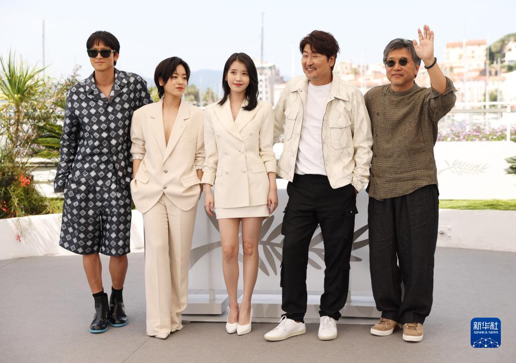 5月27日,在法国戛纳举行的第75届戛纳国际电影节上,日本导演是枝裕和、韩国演员宋康昊、李知恩、李珠英、姜栋元(从右到左)出席影片《掮客》的拍照式。