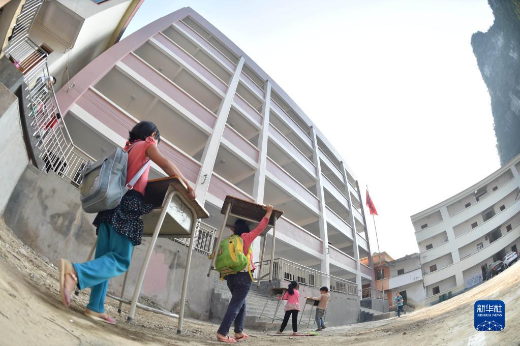 2016年9月20日,渔洞小学的孩子们将课桌椅搬进新教学楼。