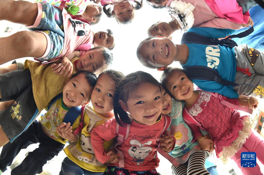 2016年10月10日拍摄的渔洞小学的孩子们在崭新的校园玩耍。