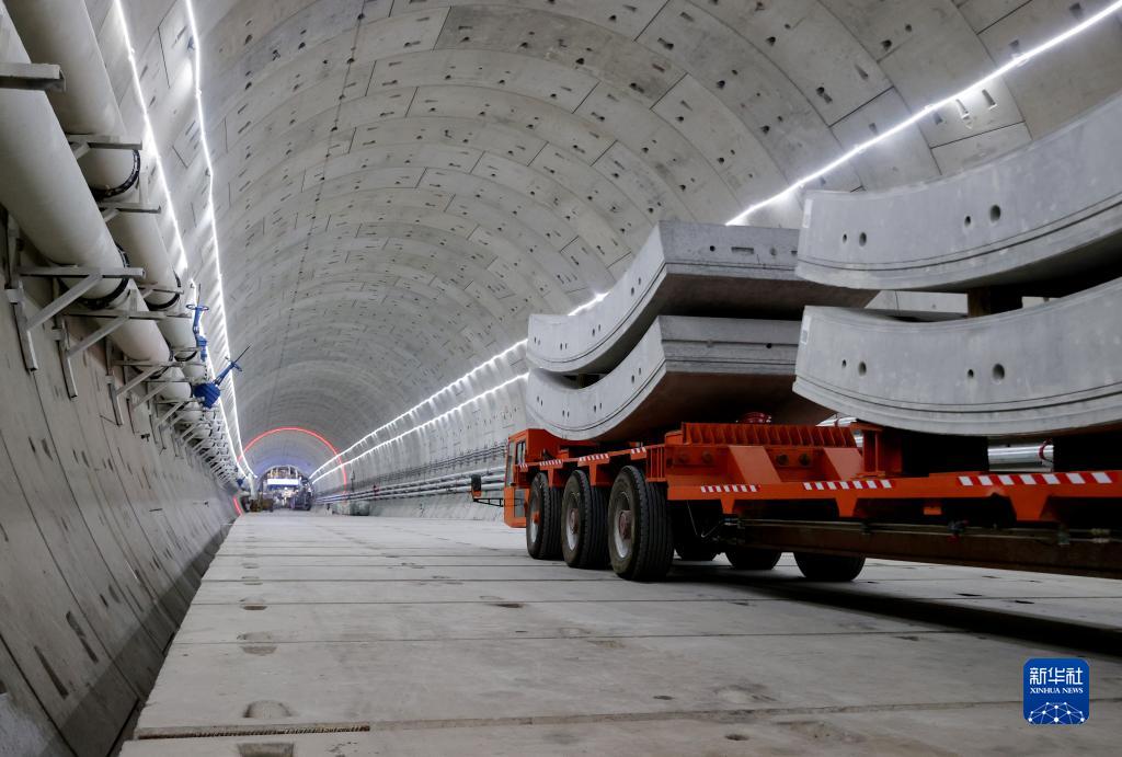 5月28日,在中铁隧道局机场联络线11标段施工现场,一辆载有管片的运输车辆行驶在隧道内。