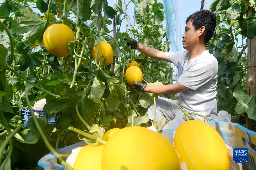 5月28日,河北饶阳县北流满村农民在大棚内采摘甜瓜。