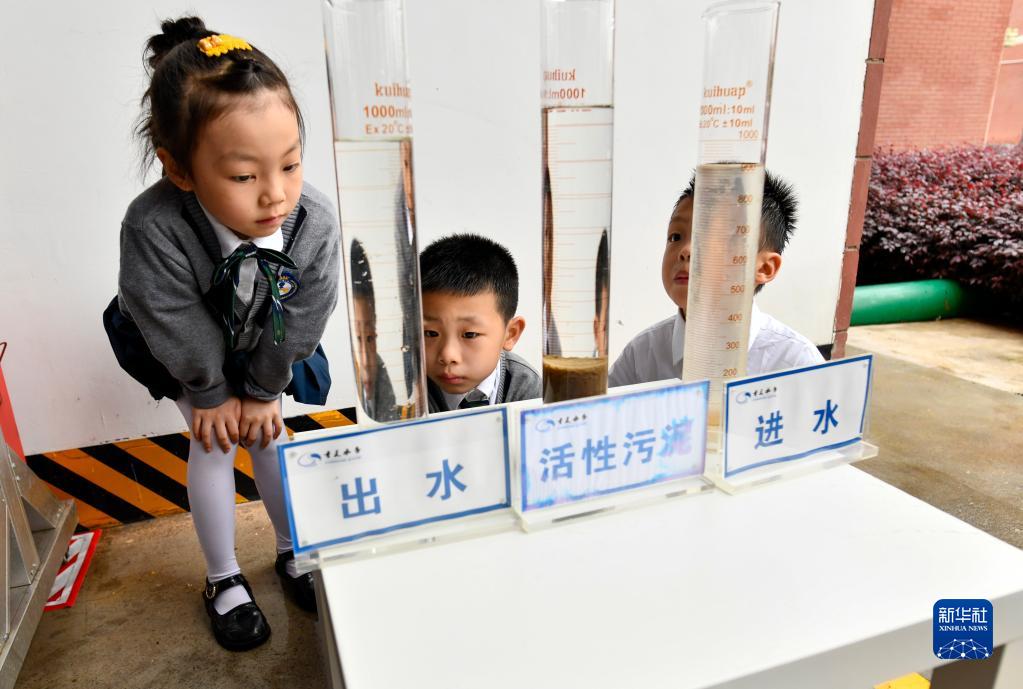 5月28日,几名参加开放日活动的小学生观察污水处理厂不同工艺环节水体样本。