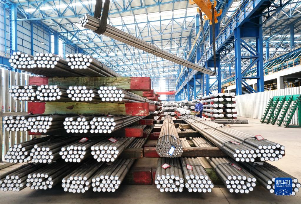 5月28日,工人在位于石家庄市井陉矿区的河钢集团石钢公司成品车间吊运棒材。