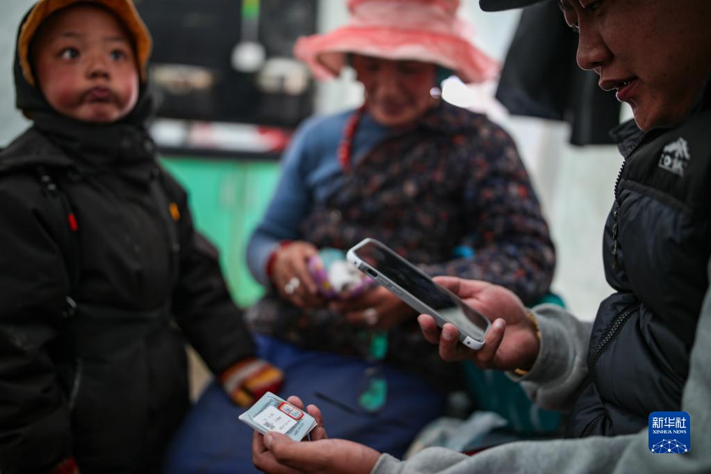 在西藏那曲市比如县良曲乡然木塘村虫草采集点,工作人员在帮助牧民其美嘎德进行虫草采集登记,以便进行总量统计(5月25日摄)。