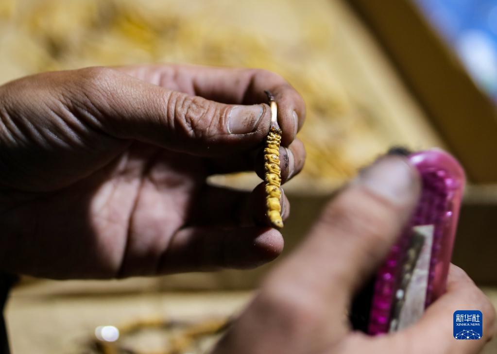 傍晚回到采集点营地后,牧民在用毛刷清理虫草上的土(5月25日摄)。